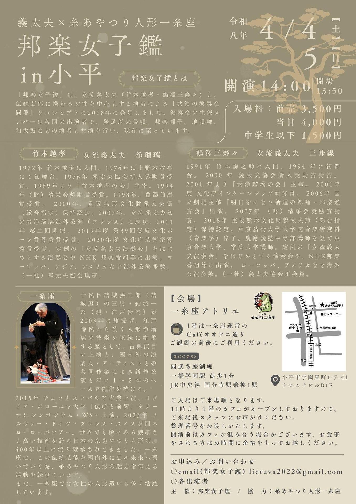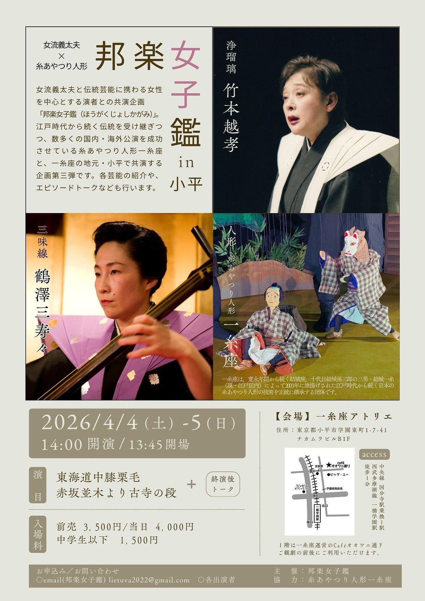 | お問い合わせ | お申し込み / お問い合わせ ○email(邦楽女子鑑)[email protected] ○各出演者 主催:邦楽女子鑑 協力:糸あやつり人形一糸座 |