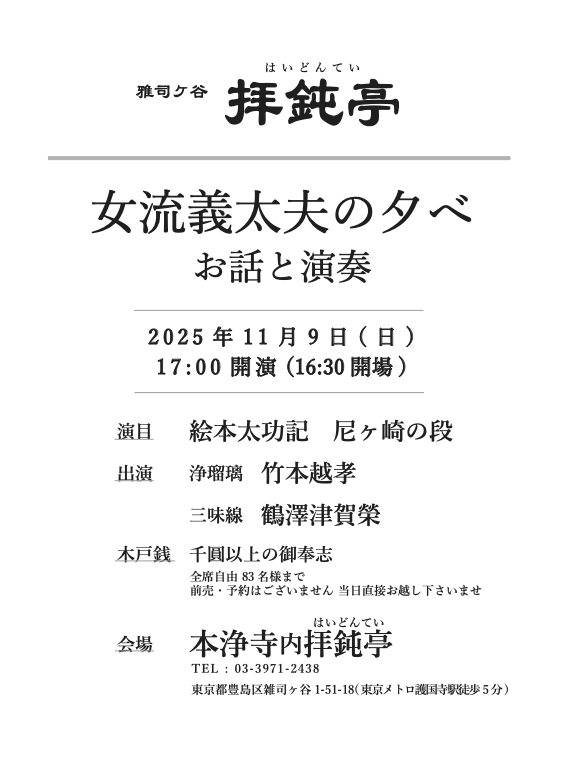 | 〈東京〉拝鈍亭 女流義太夫の夕べ | |