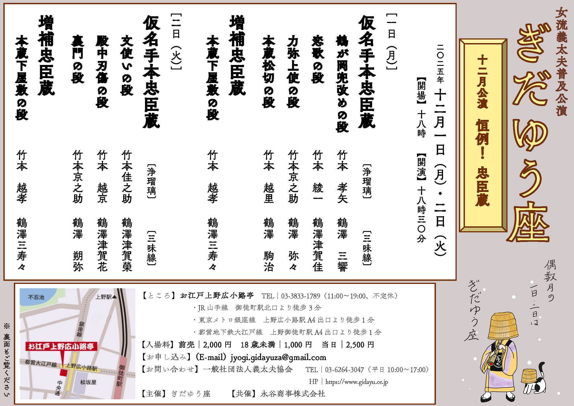 お問い合わせ | ■お問い合わせ・お申込み チケットお申し込み専用メール:[email protected] (一社)義太夫協会(月〜金10〜17時) tel: 03-6264-3047 email: [email protected] ■主催 ぎだゆう座 ■共催 永谷商事 |