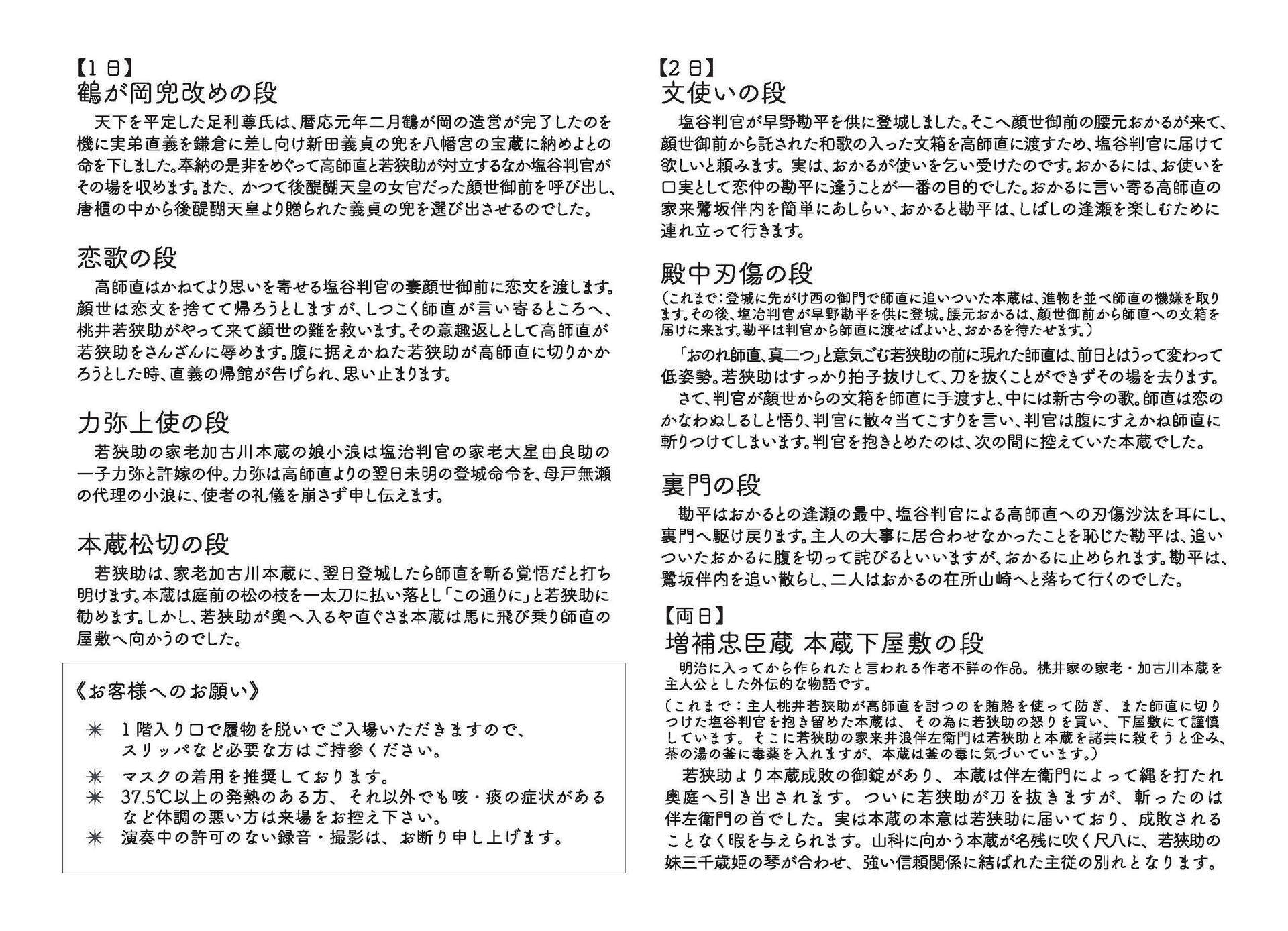 演目内容 | 【1日】 「仮名手本忠臣蔵 」 鶴が岡兜改めの段 浄瑠璃 竹本孝矢 三味線 鶴澤三響 恋歌の段 浄瑠璃 竹本綾一 三味線 鶴澤津賀佳 力弥上使の段 浄瑠璃 竹本京之助 三味線 鶴澤弥々 本蔵松切の段 浄瑠璃 竹本越里 三味線 鶴澤駒治 「増補忠臣蔵」 本蔵下屋敷の段 浄瑠璃 竹本越孝 三味線 鶴澤三寿々 【2日】 「仮名手本忠臣蔵 」 文使いの段 浄瑠璃 竹本佳之助 三味線 鶴澤津賀榮 殿中刃傷の段 浄瑠璃 竹本越京 三味線 鶴澤津賀花 裏門の段 浄瑠璃 竹本京之助 三味線 鶴澤朔弥 「増補忠臣蔵」 本蔵下屋敷の段 浄瑠璃 竹本越孝 三味線 鶴澤三寿々 |
