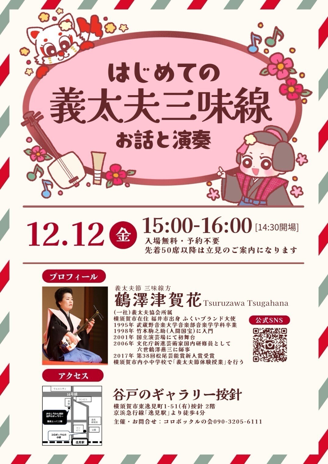 | 演目内容 | 語り【初心者】コース 12:30~13:00 三味線【初心者】コース 13:10~13:40 ※定員5名(先着) 三味線《経験者》コース 13:40~15:00 ※定員10名(先着) 語り《経験者》コース 15:10~16:00 ※各コース開始10分前から受付 ※《経験者》コースは継続して受講していただける方が対象 |