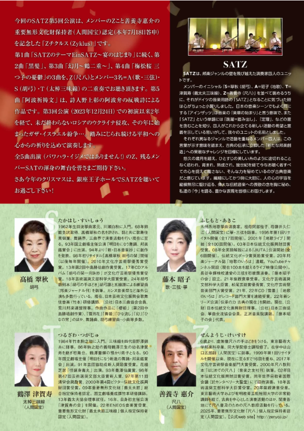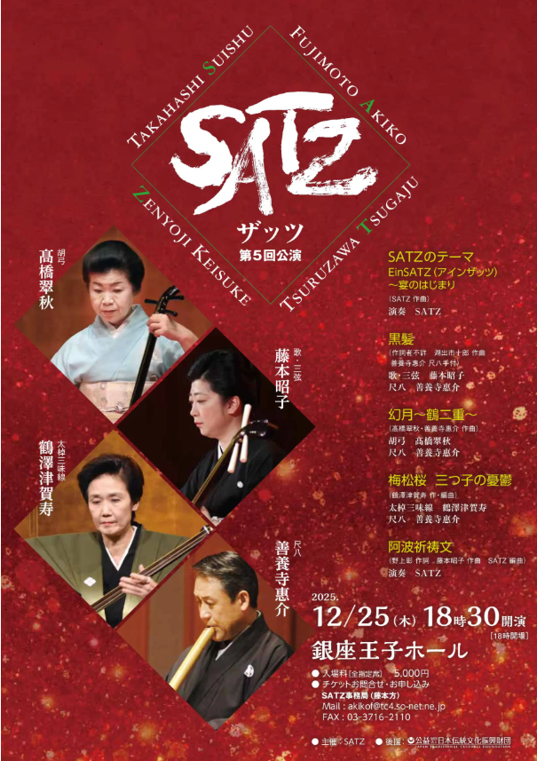 | 演目内容 | 出演 胡弓:高橋翠秋 歌・三弦:藤本昭子 太棹三味線:鶴澤津賀寿(人間国宝) 尺八:善養寺惠介(人間国宝) 曲目 SATZのテーマ「EinSATZ(アインザッツ)~宴のはじまり」SATZ作曲・演奏 SATZ 梅松桜 三つ子の憂響(鶴澤津賀寿 作・編曲)太棹三味線:鶴澤津賀寿 尺八:善養寺惠介 阿波祈祷文(野上彰 作詞 藤本昭子 作曲 SATZ編曲)演奏:SATZ |