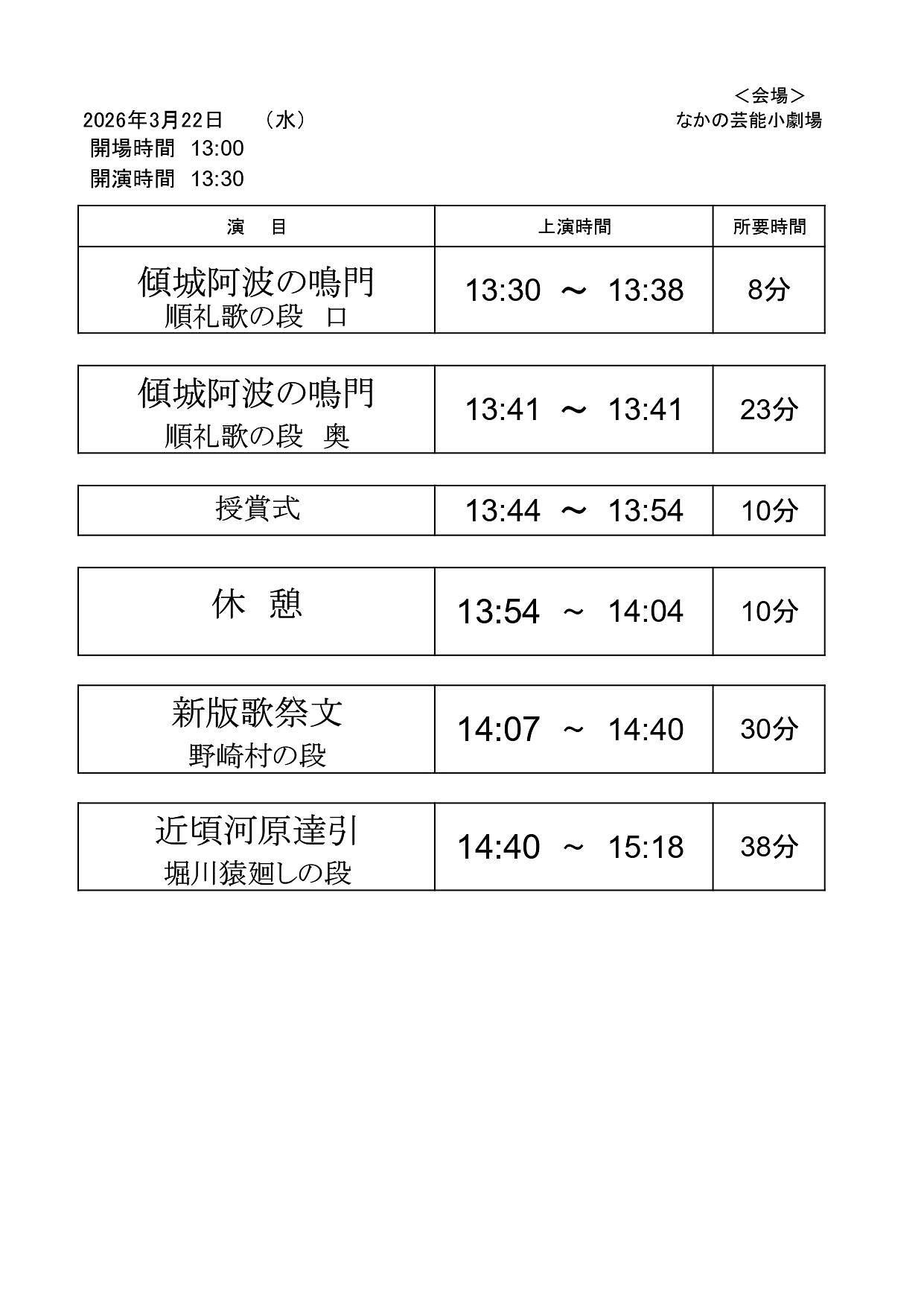 | 時間 | 昼の部 12時50分開場 13時30分開演 夜の部 17時20分開場 18時開演 |